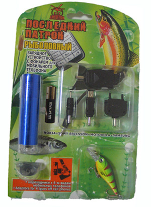 Набор "Рыболовный" содержит, кроме последнего патрона с фонариком и насадок, также рыболовный крючок с блесной. Последний патрон - это подзарядка для мобильного телефона от обычной пальчиковой батарейки! Вы не останетесь без связи в самый нужный момент ! Батарейка АА в комплекте. Так же в комплекте 4 переходника к 4-м маркам телефонов Nokia, Sony-Ericsson, Motorola, Samsung